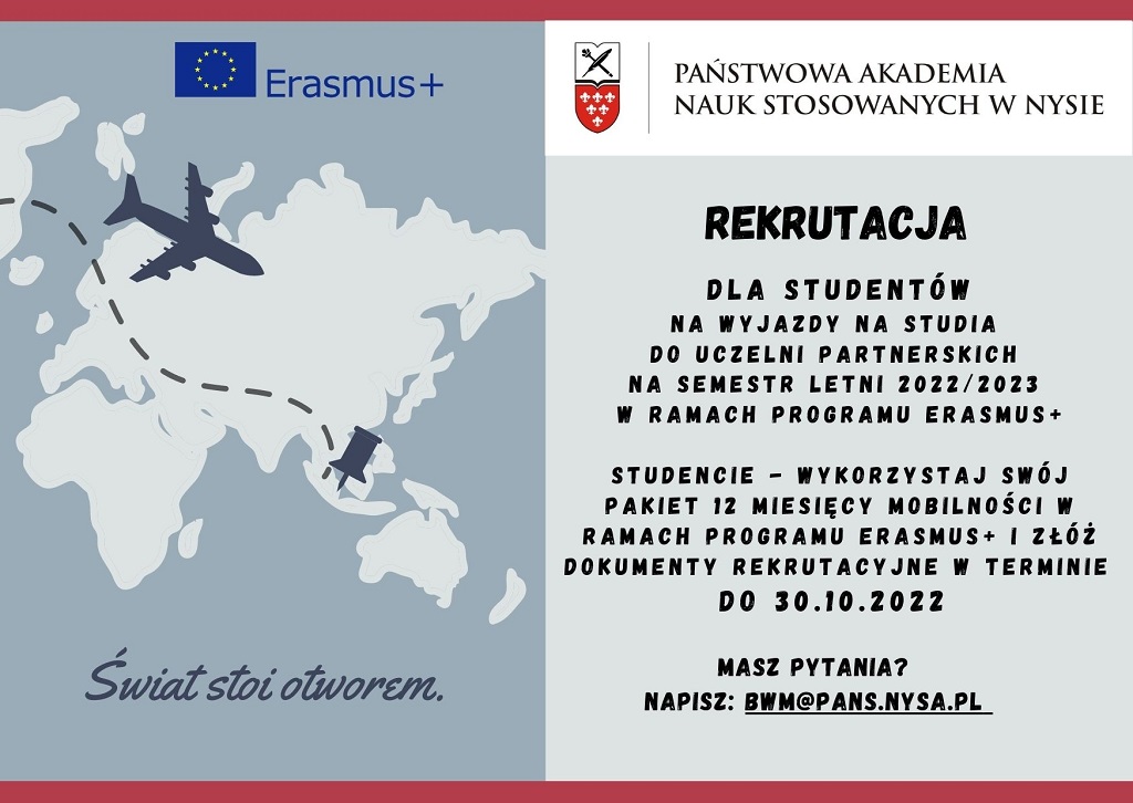 Więcej informacji na temat rekrutacji oraz mobilności w ramach programu ERASMUS+ uzyskasz kontaktując się z nami mailowo bwm@pans.nysa.pl lub na naszej stronie www.bwm.pans.nysa.pl w zakładce Erasmus+.